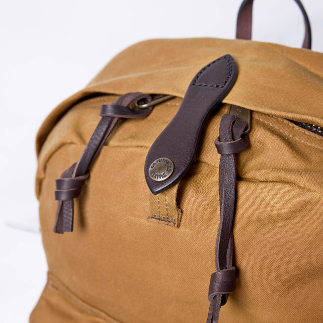 - Rugged cotton twill and 15oz. oiled tin cloth exterior, moleskin cotton/poly lining, brass YKK zippers and bridle leather trim and straps.