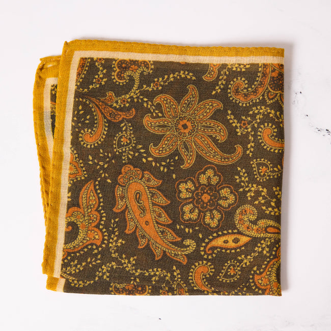 Olive Floral Paisley Print Pocket Square by Harrison Limited