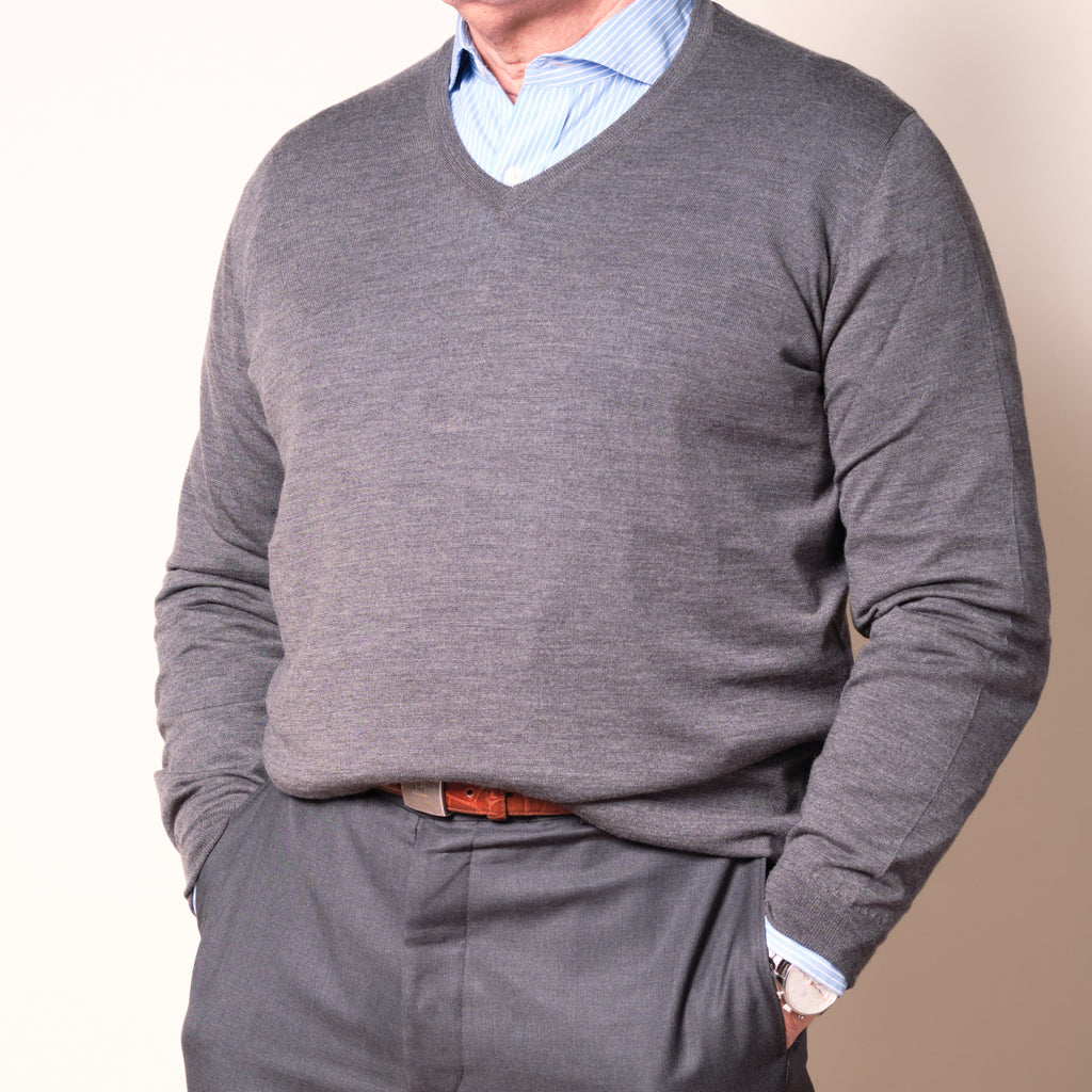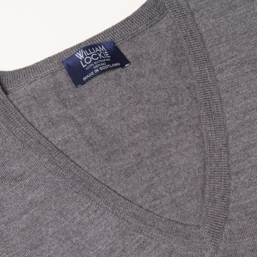 Oxford Grey Superfine Merino Vee Neck Sweater by Wm. Lockie